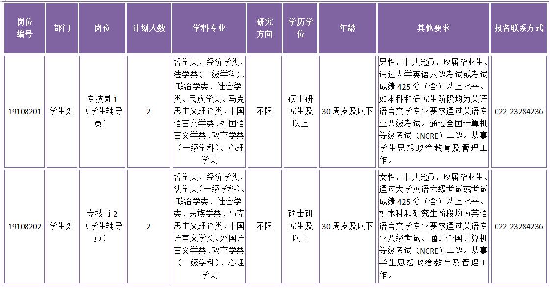 具体招聘岗位见《天津外国语大学2019年第二批公开招聘计划(学生辅导员岗位)》(附表1)